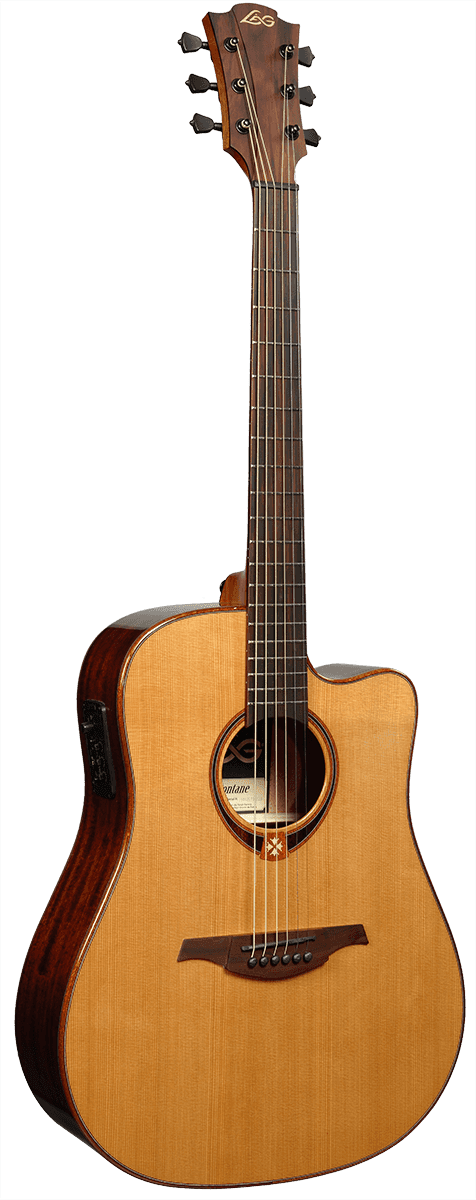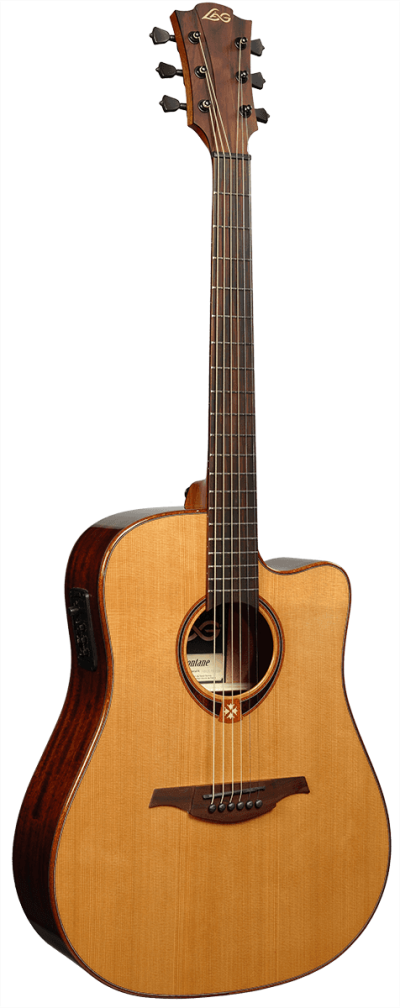LAG T118DCE Dreadnought Cutaway Acoustic-Electric-Acoustic Guitar Drawing inspiration from the natural beauty of Southern France, the birthplace of LAG Guitars, the T118DCE maintains the Tramontane tradition of aesthetic grace without compromising tonal performance. Body and Shape Featuring a powerful dreadnought cutaway shape, the T118DCE ensures an expansive and resonant sound. The body, adorned with a glossy varnish finish, pairs with a solid Red Cedar top and Khaya back and sides to create both visual appeal and tonal excellence. Acoustic-Electricnics The Acoustic-Electric-acoustic version of the T118 series, this guitar incorporates the AstroLAG preamp, granting complete control over Volume, Low, Middle, High, Brilliance, Notch, and Phase. A built-in tuner further enhances its usability in all situations. Premium Features Boasting a black graphite nut, saddle, and bridge pins which match the black die-cast machine heads, the T118DCE reveals LAG's attention to detail. The headstock, bridge, and fingerboard, crafted from BrankoWood, reflect an elegant symmetry, mirroring the iconic Tramontane headstock shape. Its quarter-round body bindings not only beautify the instrument but also provide extraordinary comfort when playing for longer sessions.