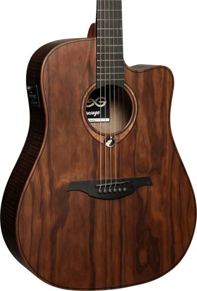 LAG Sauvage-DCE Dreadnought Cutaway Acoustic-Electric Acoustic Guitar The LAG Sauvage-DCE is a dreadnought cutaway Acoustic-Electric acoustic marvel that continues LAG's tradition of crafting beautiful and innovative guitars. With its StageLAG preamp system and unique design, the Sauvage-DCE offers exceptional playability and a rich tone. The FSC Certified BrankoWood and eco-friendly varnishing process manifest the brand's commitment to sustainability, while the rough sawn look and rounded back reflect a robust and adventurous spirit. The LAG Sauvage-DCE dreadnought cutaway Acoustic-Electric acoustic guitar is an innovative fusion of tradition and modernity. Its sleek design and powerful StageLAG preamp system offer unparalleled playability and sound quality. Eco-Friendly Craftsmanship Utilizing FSC Certified BrankoWood and an eco-friendly varnishing process, the Sauvage-DCE represents a blend of aesthetic excellence and environmental consciousness. StageLAG Preamp System The Sauvage-DCE is equipped with the advanced StageLAG preamp system, offering controls for Volume, Low, Middle, High, Phase, Notch, and a tuner. It ensures precise sound adjustment and a rich, vibrant acoustic experience. Aesthetic Excellence Mirroring the iconic LAG headstock design on the bridge and featuring black machine heads, the Sauvage-DCE achieves an elegant symmetry. The rough sawn look on the back and sides, along with a light oil finish on BrankoWood components, add character and grace. Playability & Comfort The dreadnought cutaway shape, combined with quarter round body bindings, enhances playability and comfort. The graphite nut & saddle provide stability and quality in playing experience. Sauvage Legacy The LAG Sauvage-DCE is more than a guitar; it's a rugged musical companion that comes with a sturdy gig bag, ready for the open road. With its unique combination of aesthetic beauty, technological sophistication, and robust design, it captures the essence of the LAG brand.