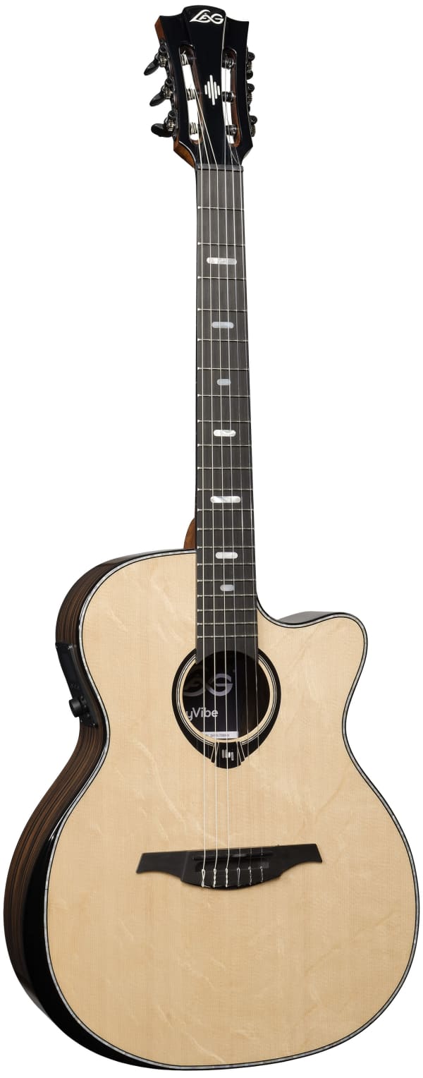 The HyVibe 50 series, designed for musicians who demand the best, offers luxury guitars with exceptional sound. Available in three models, this series features by Macassar ebony back and sides, as well as the addition of an elegant bevel for optimal comfort. Finally, abalone inlays adorn the rosette, bindings, neck, and headstock. New preamp, new ergonomy After several years of development, HyVibe has evolved its technology and introduced a new preamp. The H2 system, equipped with a more powerful processor and based on a new sound processing algorithm for the purest sound, takes sound quality to an unparalleled level. Its improved interface is now more intuitive, offering precise control and faster access to features. • More powerful processor : Faster, seamless performance for integrating digital effects. • New algorithms for enhanced sound quality : Superior, dynamic tones for the looper, effects and bluetooth music streaming. • Precise control of effects parameters : Intuitive interface for fine-tuning sound. • Shortcut buttons for quick access : Easy, quick access to features for a user-friendly experience. • Color screen with enhanced graphics : Improved visibility and engaging visuals.